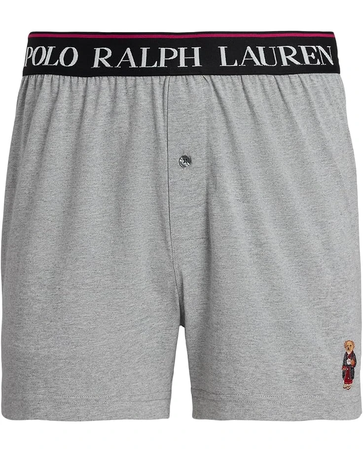 - Upgrade your essentials with the Polo Ralph Lauren® Bear Knit Boxer. These boxers are made from soft cotton jersey that wicks away moisture to help keep you dry and comfortable. Featuring elasticated waistband with branding allover, buttoned fly, thigh-length silhouette, and brand logo on the left thigh.