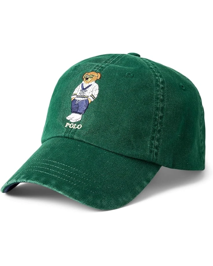 - Enjoy sunny days in style with the Polo Ralph Lauren® Classic Cotton New Bond Chino Novelty Bear. Crafted from cotton, this hat features a six-panel construction, curved brim, sewn eyelets, and an adjustable leather strap with buckle closure.