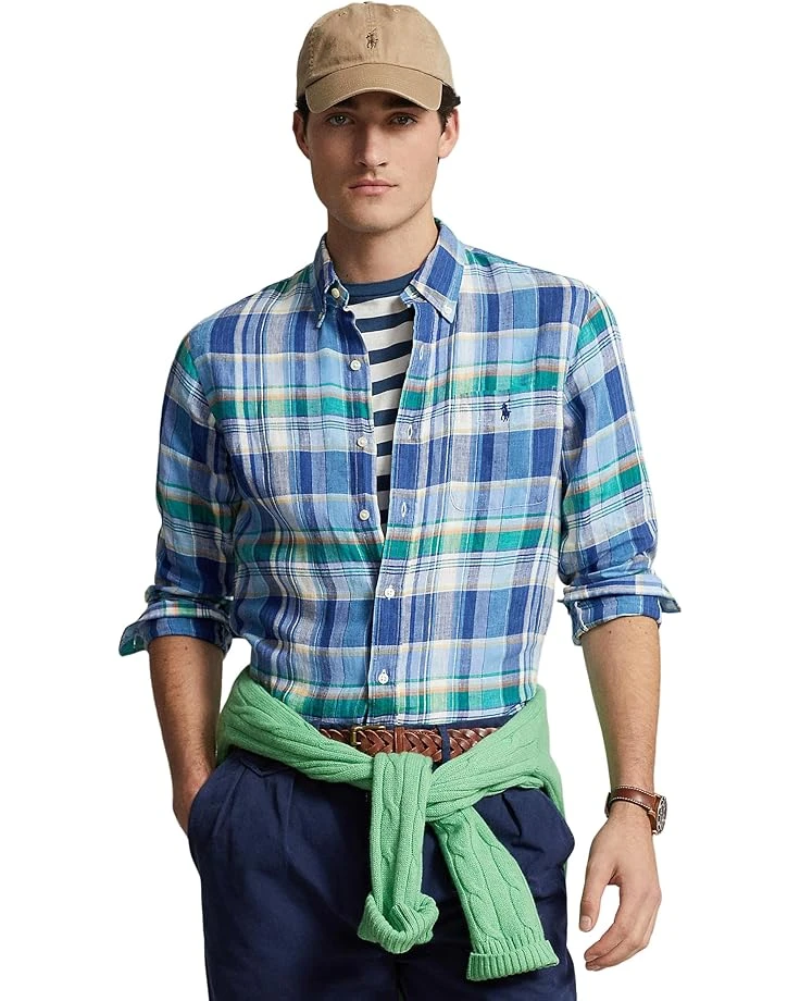 - Add a retro inspired flair to your basic look with the Polo Ralph Lauren® Classic Fit Plaid Linen Shirt. This lightweight linen shirt is constructed with a button-down collared neck, full button front closure, adjustable button cuff long sleeves, upper back pleat, embroidered signature pony logo at the left chest and finished in an allover plaid pattern to keep your preppy style trendy.