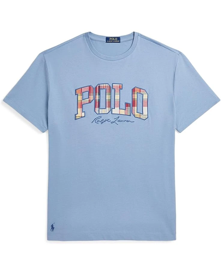 - Instantly elevate your off-duty look donning Polo Ralph Lauren® Classic Fit Plaid-Logo Jersey T-Shirt. Featuring a trendy crew neck and short sleeves, this shirt stands out with unique plaid appliqués spelling out ‘Polo’ and ‘Ralph Lauren,’ complemented by script embroidery.