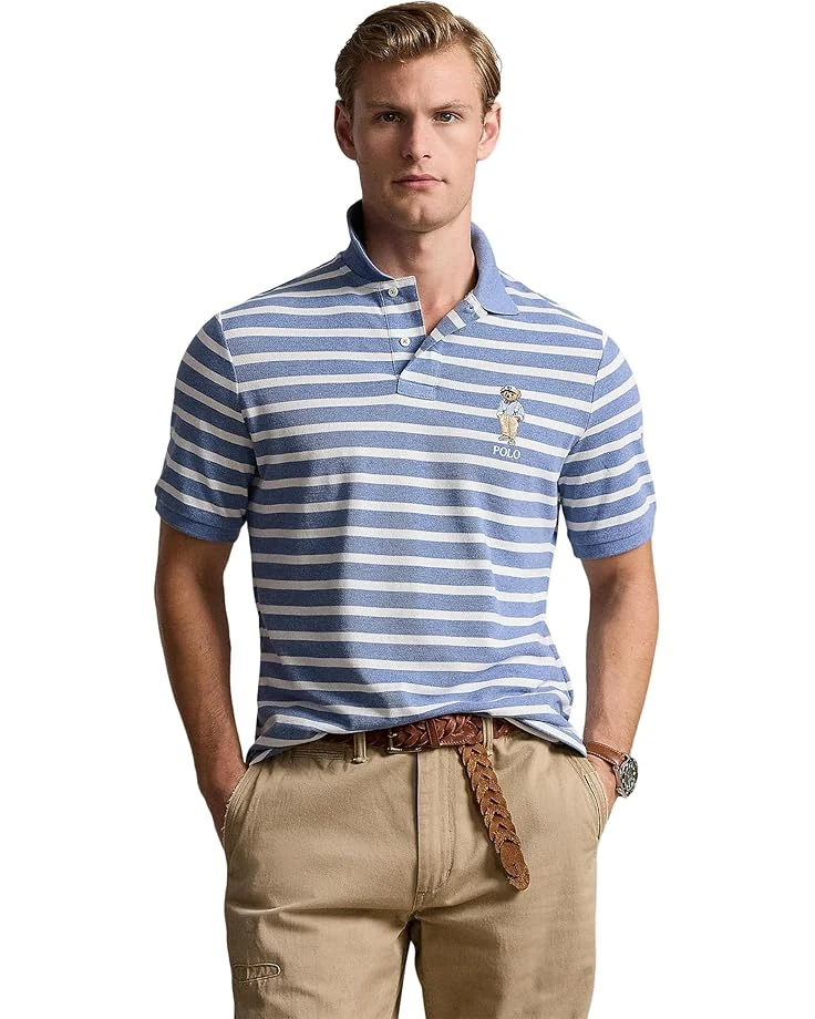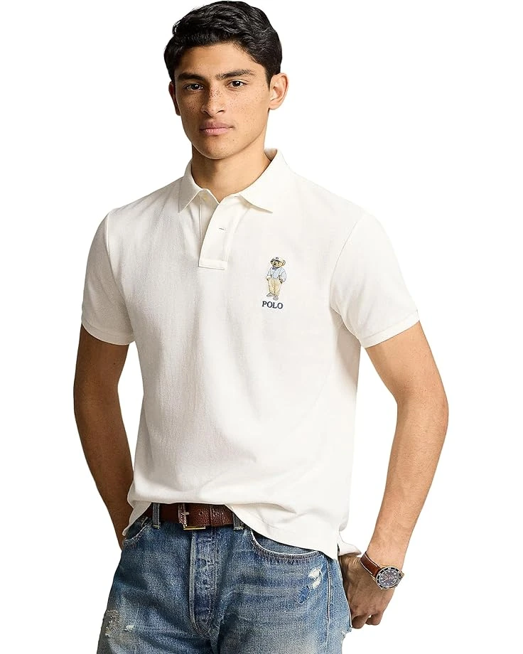 - For a look that’s as versatile as your social calendar, look no further than the Polo Ralph Lauren® Custom Slim Fit Polo Bear Polo. The slim-fit polo is crafted from a soft pique knit with a rib trim at the fold-over collar and short sleeve and finished with a embroidery at the left chest.
