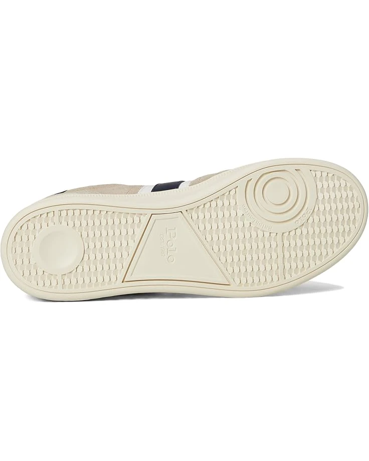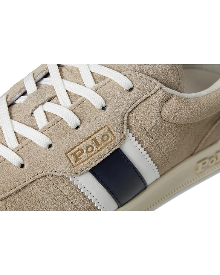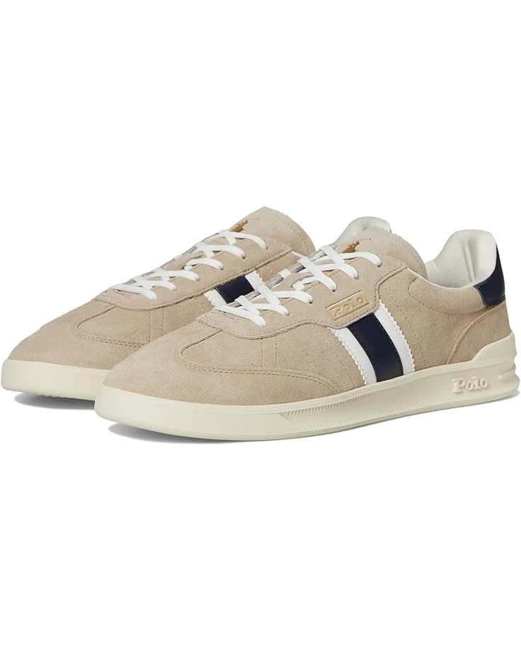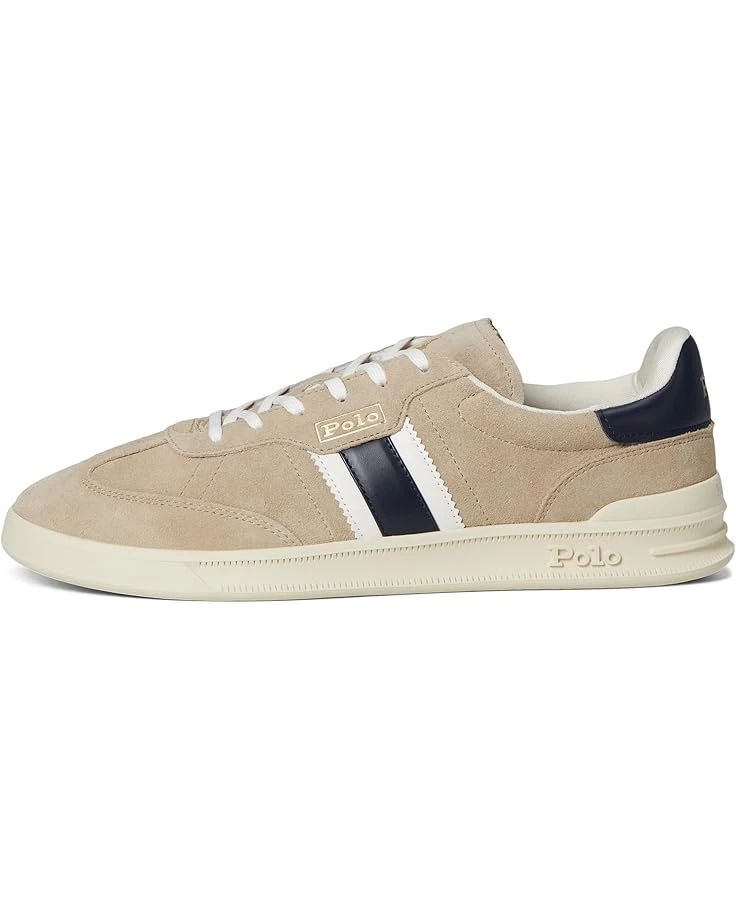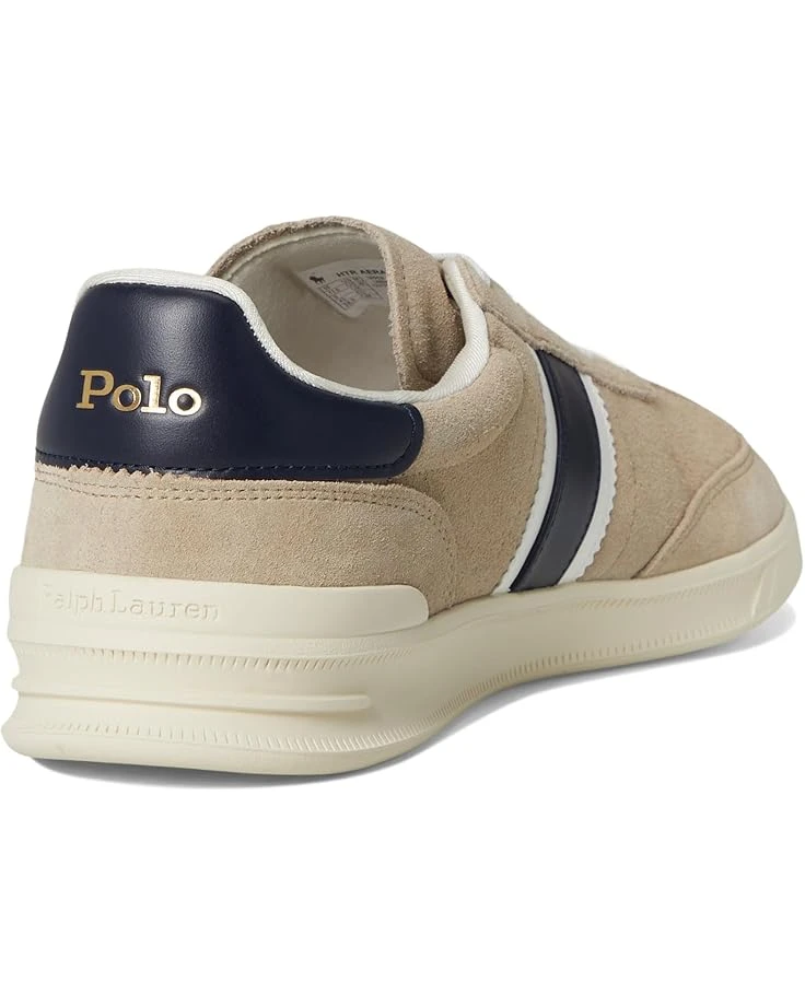 - The Polo Ralph Lauren® Heritage Aera Suede Sneakers update Polo’s classic sneaker with a vintage-inspired silhouette realized in suede upper. Featuring a rubber cupsole construction with integrated heel support and a dual-compound EVA midsole, it is detailed with leather stripes at the side and embossed logo accents. The low-top shoes have polyester lining, padded mesh insole, reinforced heel with leather heel tab, and textured rubber outsole.