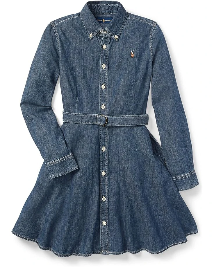 - Have her dressed up in a classic casual look with the Polo Ralph Lauren® Kids Belted Cotton Denim Shirtdress. This cotton polo shirt dress is crafted with a button-down collar neckline, full button placket, long sleeves with adjustable buttoned barrel cuffs, back yoke, multicolored signature embroidered pony at the front left chest, removable waist belt, ruffled bottom and finished in a dark indigo wash for a timeless design.