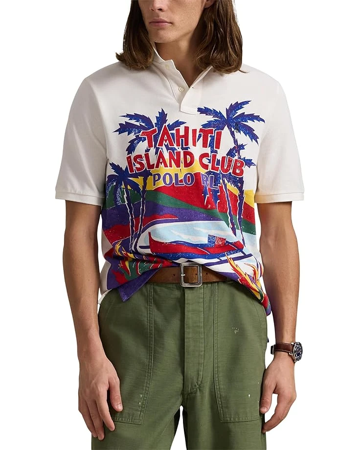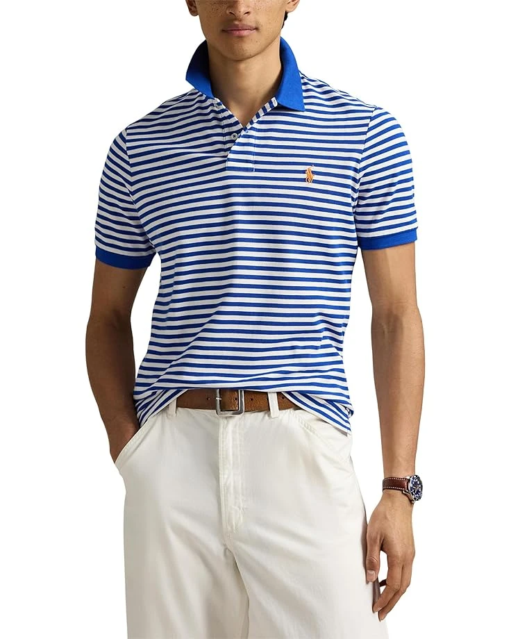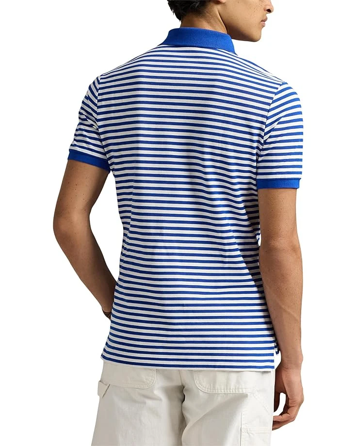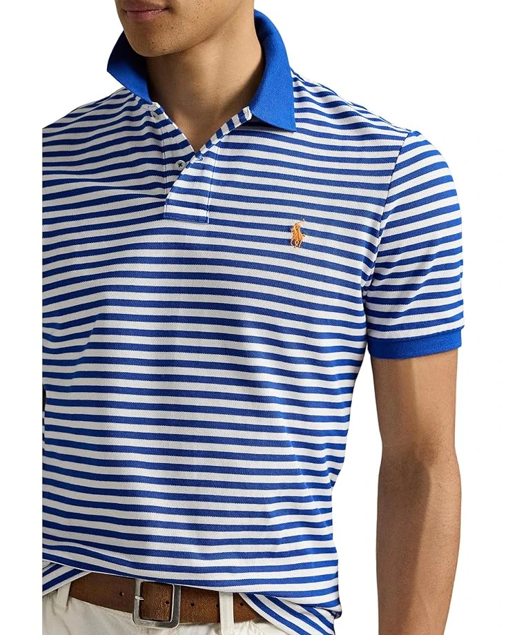- The Polo Ralph Lauren® Short Sleeve Animated Mesh – Classic features signature logo printed across the chest in collegiate-style block letters. It has a collared neckline, short sleeves, and allover stripe print pattern.
